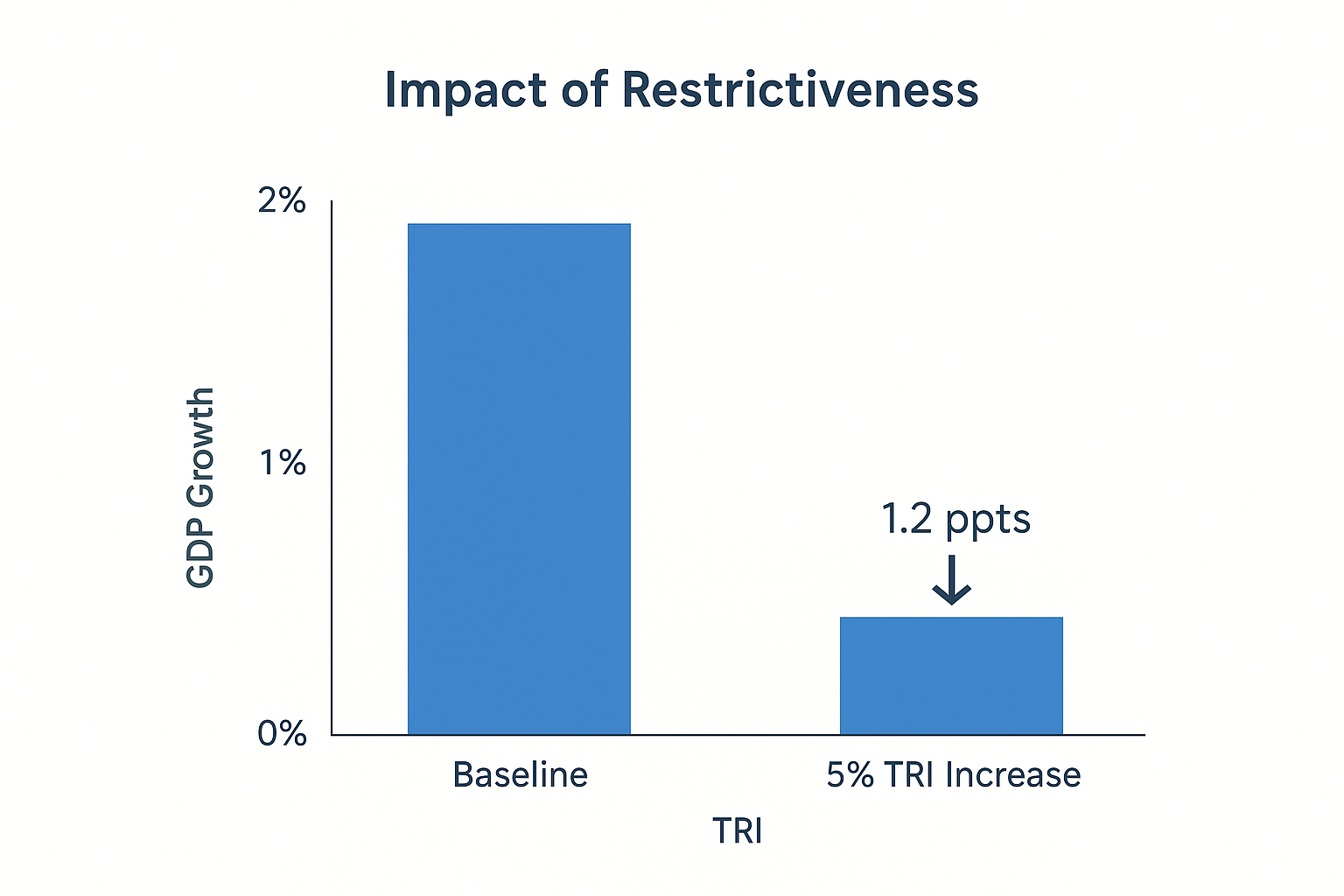 Our model shows that a 5% increase in the average global Trade Restrictiveness Index (TRI) leads to a 1.2 percentage point compression in forecast global GDP growth, demonstrating the quantifiable cost of protectionism.